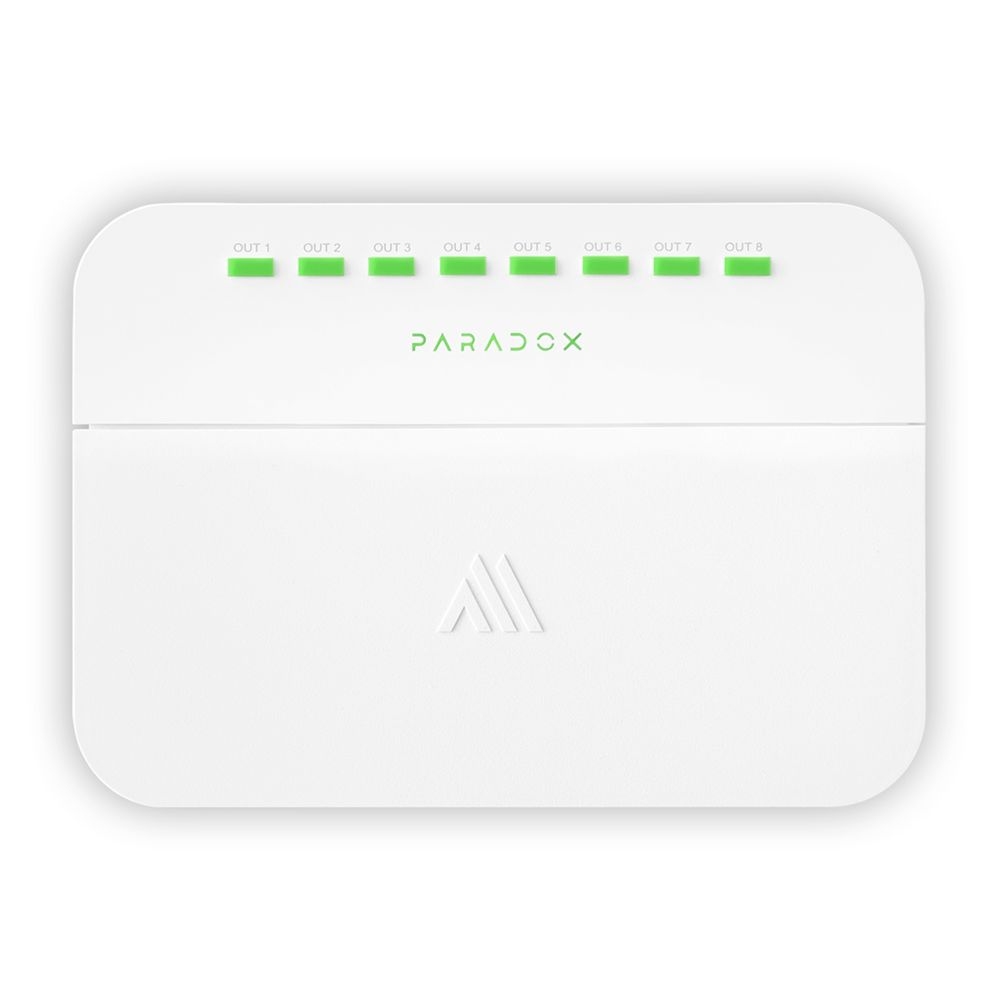 Bezdrátový PGM modul Paradox PGM8M s obousměrnou komunikací slouží pro ovládání osmi releových výstupů v M systému, vyžaduje externí napájení 12 V DC/1A min., výstupy lze ovládat ručně buď přímo tlačítky na předním panelu modulu nebo přes aplikaci BlueEye, modul obsahuje vestavěnou dobíjecí lithiovou baterii, která umožňuje modulu provoz bez napájení až 10 dní.