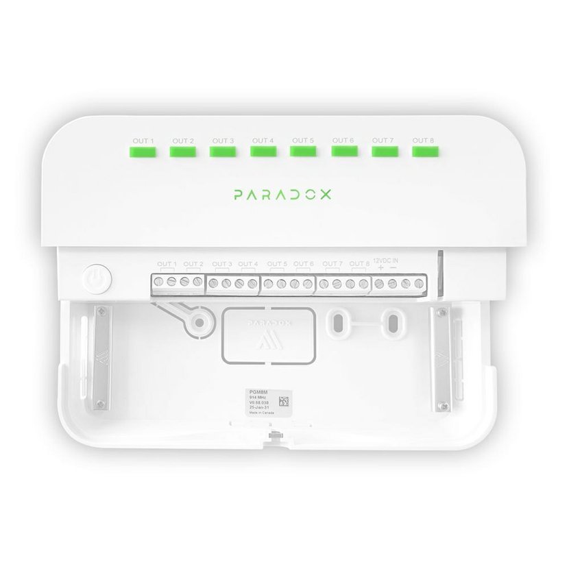 Bezdrátový PGM modul Paradox PGM8M s obousměrnou komunikací slouží pro ovládání osmi reléových výstupů v M systému, vyžaduje externí napájení 12 V DC/1A min., výstupy lze ovládat ručně buď přímo tlačítky na předním panelu modulu nebo přes aplikaci BlueEye, modul obsahuje vestavěnou dobíjecí lithiovou baterii, která umožňuje modulu provoz bez napájení až 10 dní.