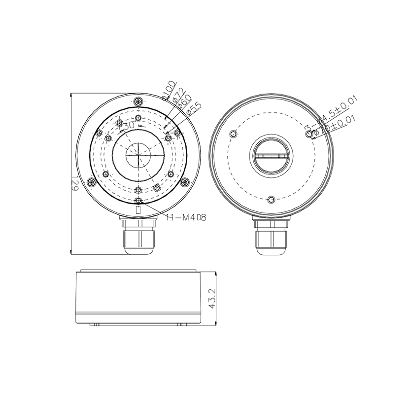Patice pro bullet kamery Hikvision. Rozměry: průměr 100mm, výška 43,2mm. Rozměr s kabelovou průchodkou: 129mm. Bílá barva.