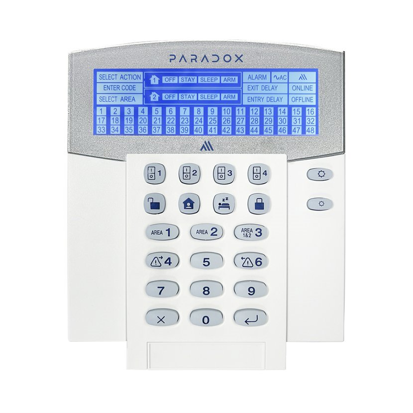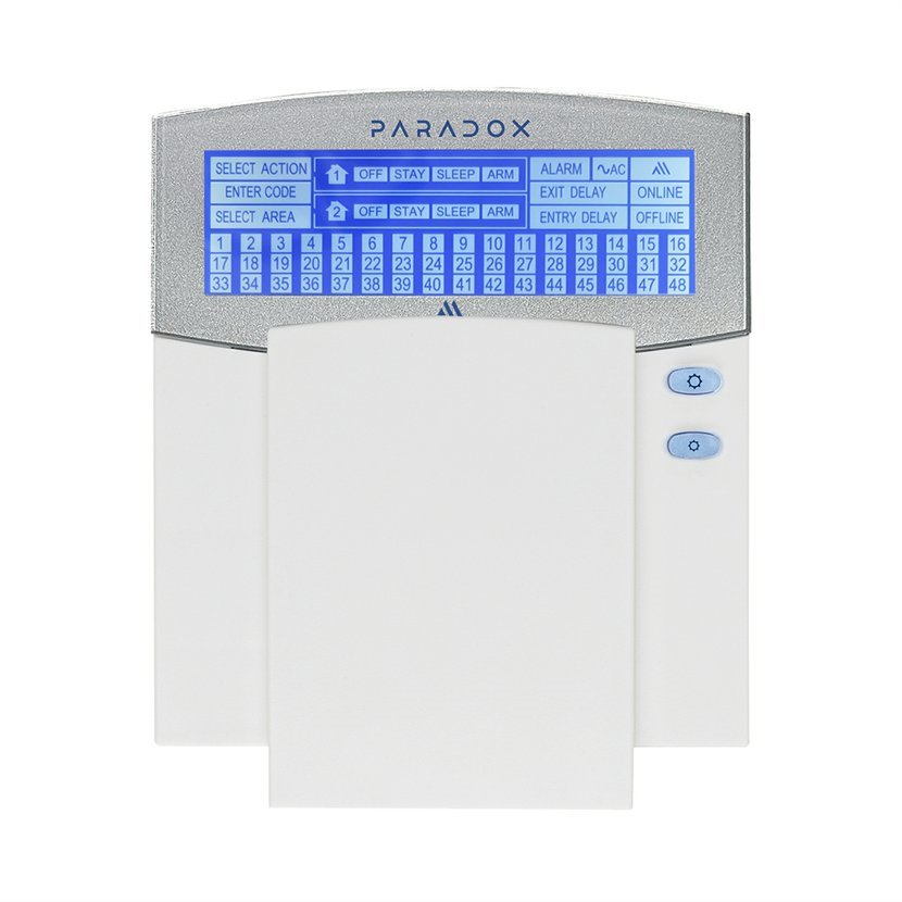 Bezdrátová ICON klávesnice PARADOX K38M s displejem k sytémům Paradox M, která umožňuje zobrazování až 32 zón a základních informací o stavu ústředny pomocí jednoduchých a výstižných ikon a číslic. Pomocí ICON klávesnice nelze prohlížet historii událostí ústředny.Klávesnici lze volitelně napájet externím zdrojem.