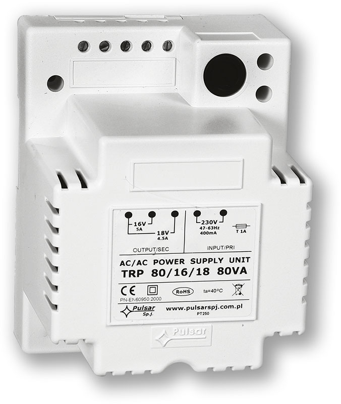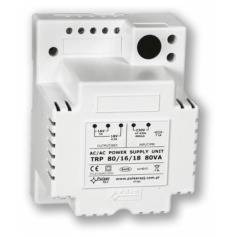 Transformátor Pulsar 80 pro napájení zabezpečovacích ústředen např. Paradox, vstupní napětí: 230 V~ / 50 Hz, výstupní napětí: 16 V~, 18 V~